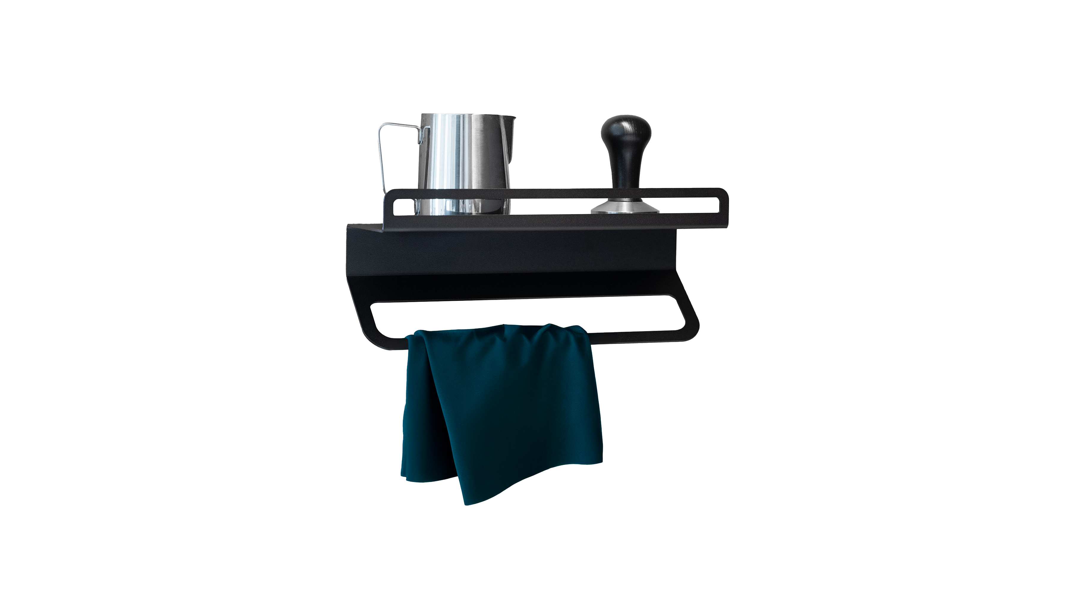 Featuring a shelf for barista accessories such as a milk jug, scale, or tamper, the Towel Rack ensures that you always have everything within reach. Additionally, it includes the well-known convenient towel holder from the Barista Rack, which is suitable not only for towels but also for kitchen hooks.