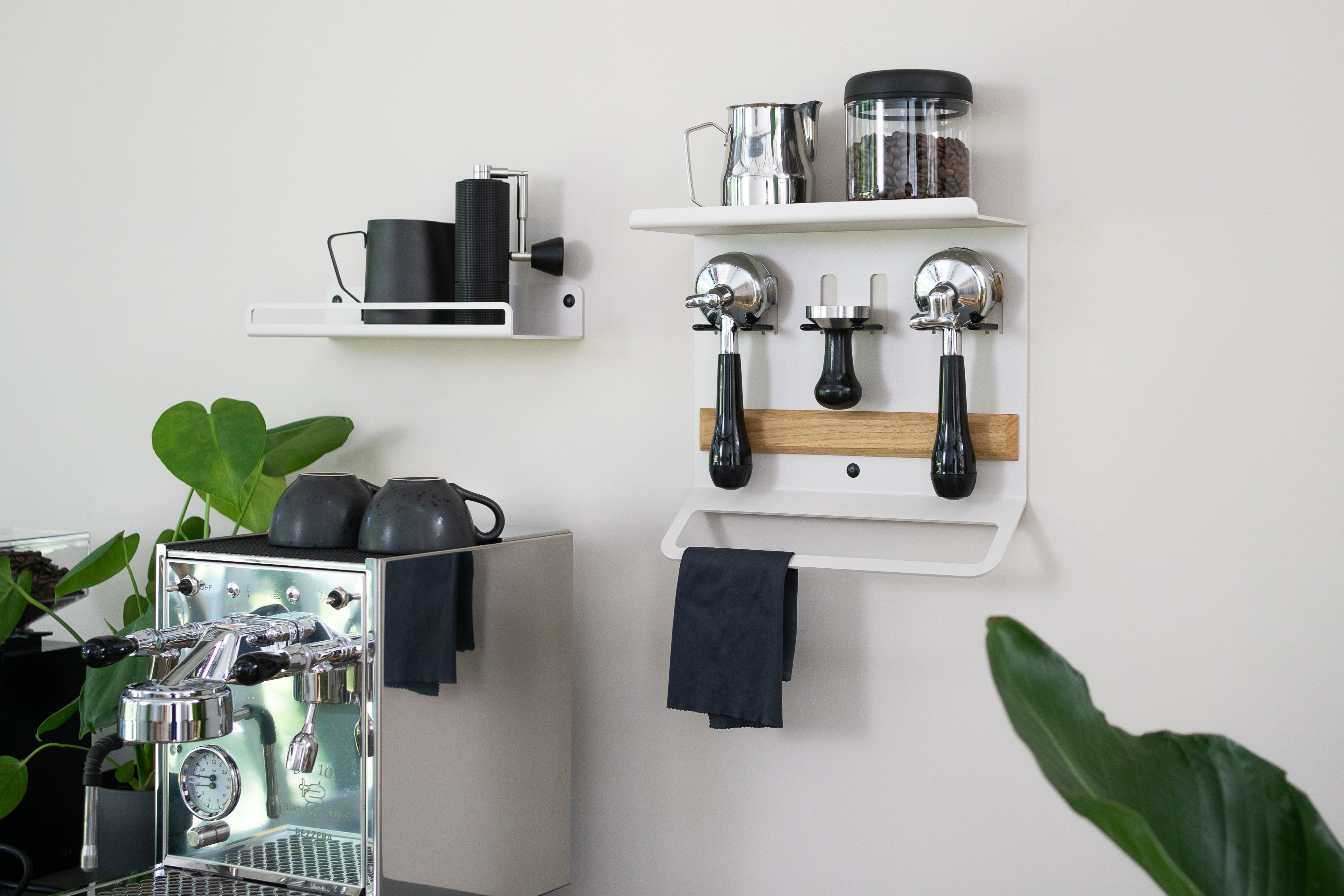 FLATE® Barista Board är tillverkad av robust, pulverlackerat stål och erbjuder olika organisationsalternativ: Med tre hållare för portafilter eller tamper, ett generöst förvaringsutrymme för ytterligare baristaredskap som vågar eller bönbehållare och en upphängningsanordning för baristadukar eller kannor.