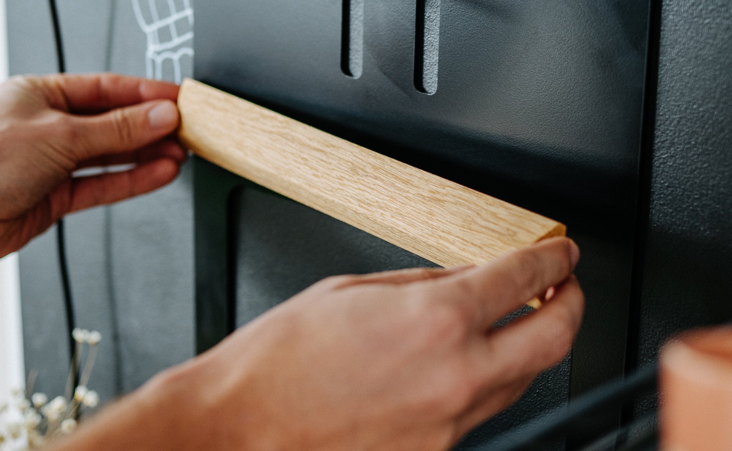 Hyllan monteras enkelt och säkert på väggen med hjälp av de medföljande pluggarna och skruvarna. Den magnetiska trälisten kan placeras i önskad position.